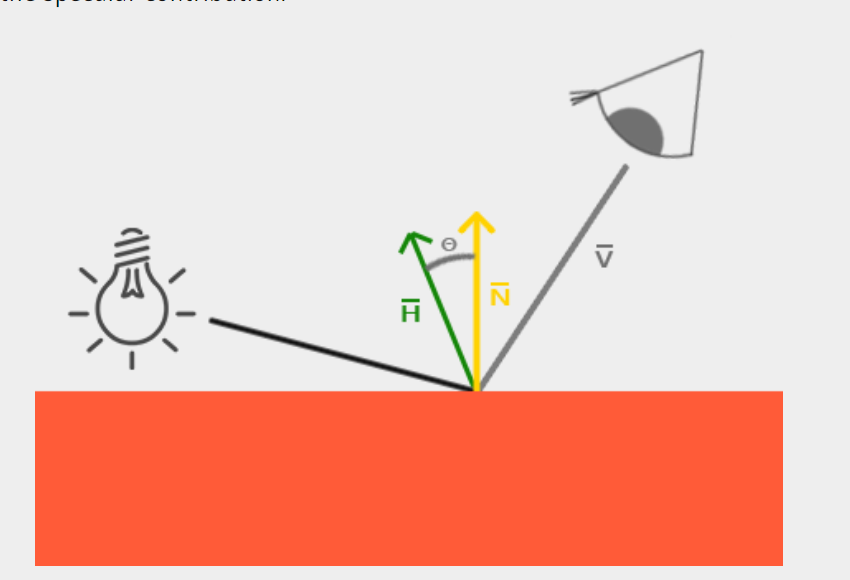 然后镜面反射项的实际计算变成了表面法线和中间向量之间的点积,以获得它们之间的余弦角,我们再次提炼出一个specular shininess exponent镜面反射光泽指数: