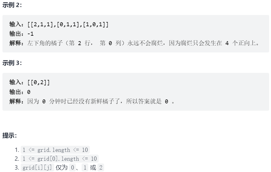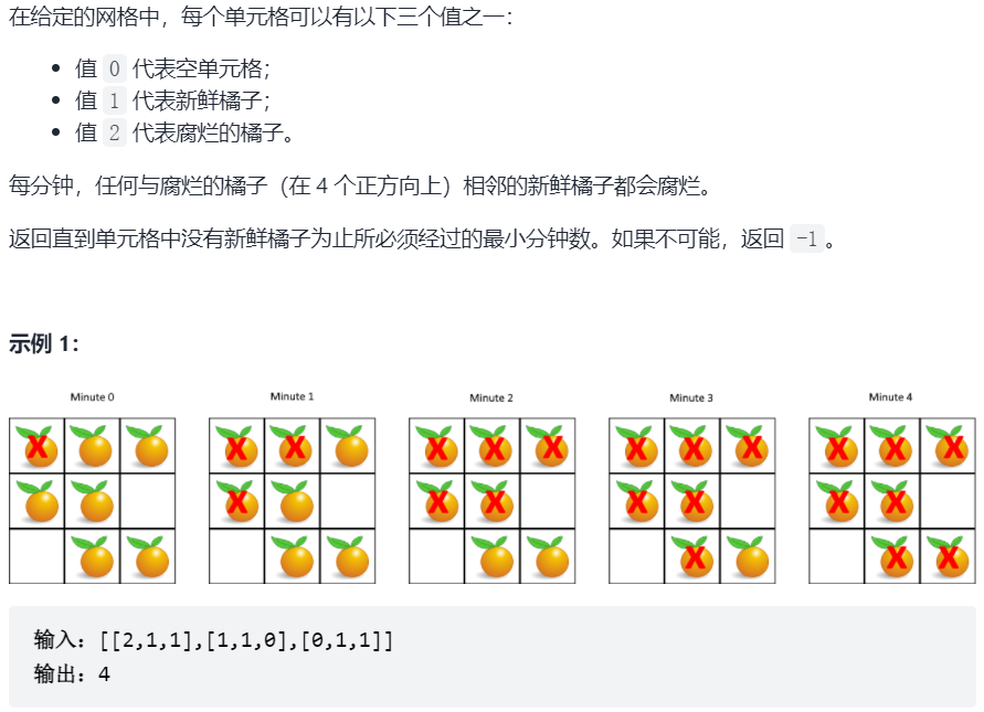 注意网格中没有腐烂的橘子的情况(如[[0]],[[1]]),前者结果应为0,后者结果为-1。
