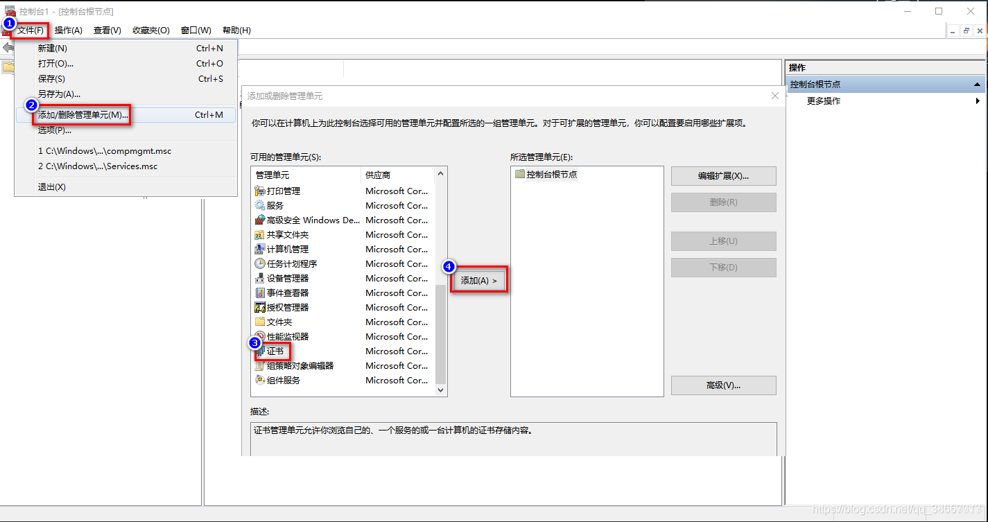 选择证书 → 添加 → 计算机账户(其他的保持默认,一直下一步)