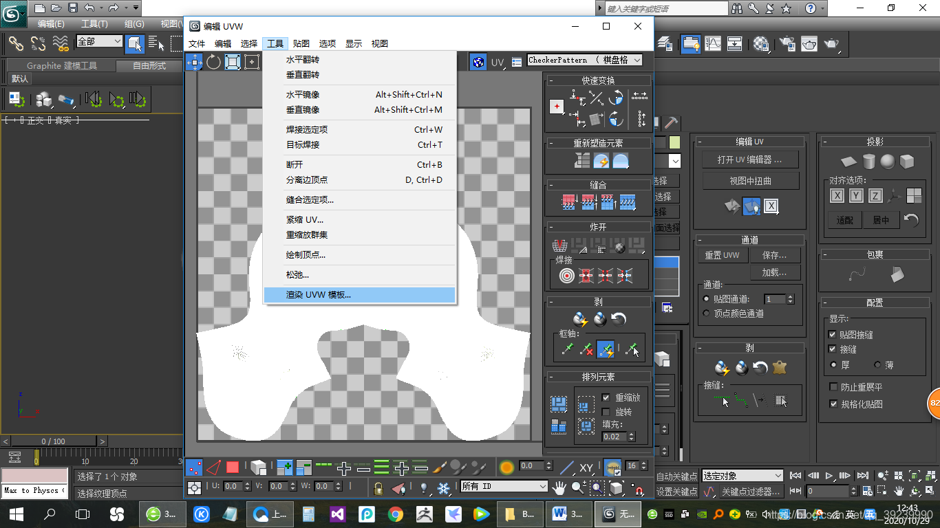 1选择物体 2添加 UVW展开 修改器 3uvw展开 修改器属性 打开UV编辑器… 4 工具 –》渲染UVW模板 模式-法线 5渲染 导出法线贴图 6与纹理贴图合并到PHOTOSHOP中 定位位置 绘画内容 后贴回模型上