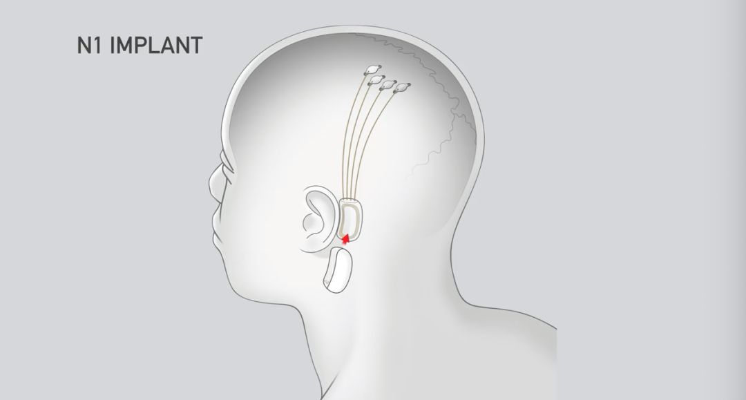 接下来Max展示了N1 sensor概念图:一个小型处理器位于颅骨表面,捕获来自电极的信息,这些电极位于可能穿透大脑数厘米的细线上?