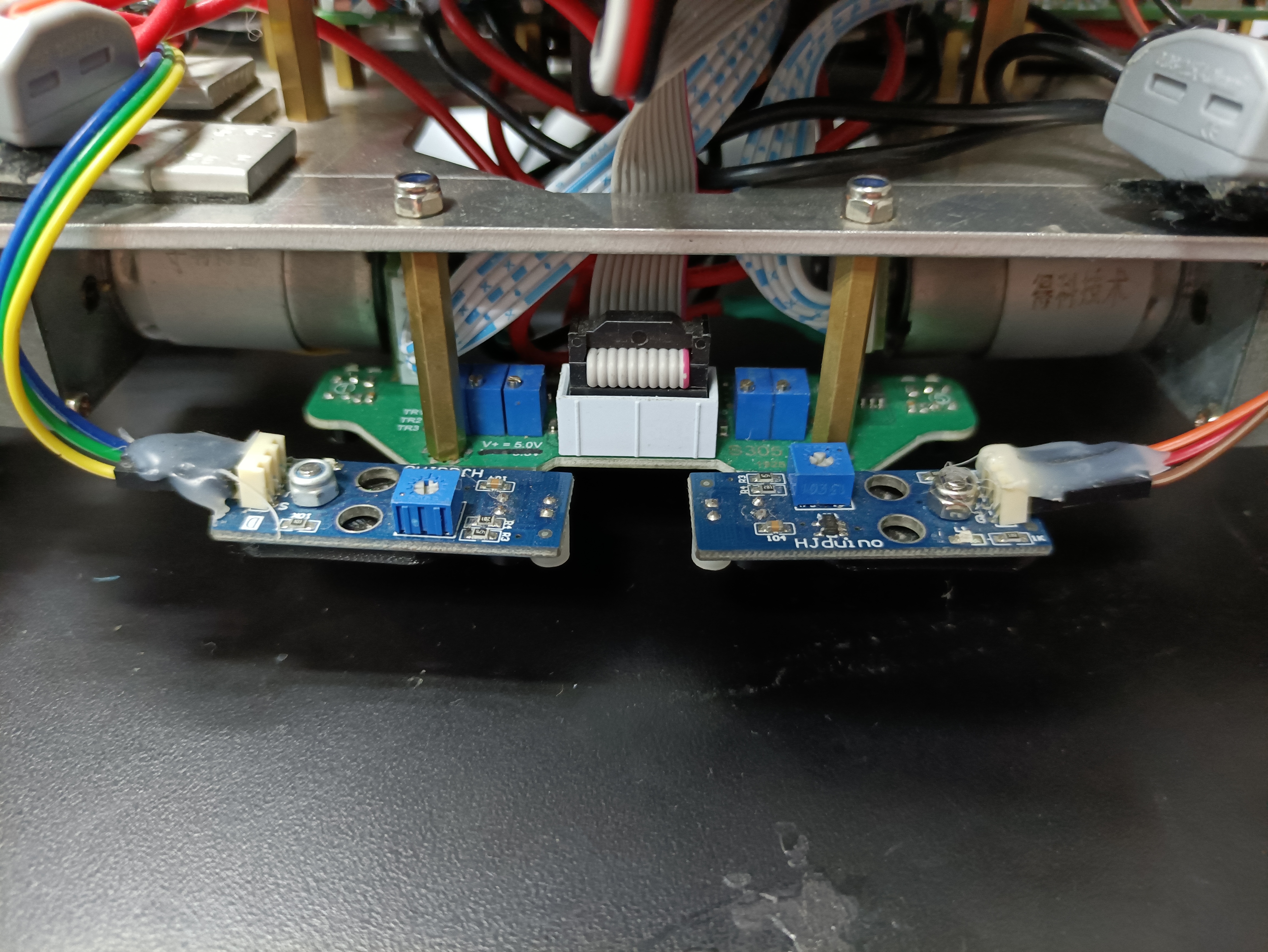 我们一开始用的是淘宝上现成的五路灰度传感器,68块钱一个,价格感人,用着用着就发现问题还是很多的,比如说间距不合适导致车停不准,为了解决这个问题,就弄了俩更丑的灰度卡着线,卡线精度可以自己调整间距调整,这个方法除了丑也没别的问题。