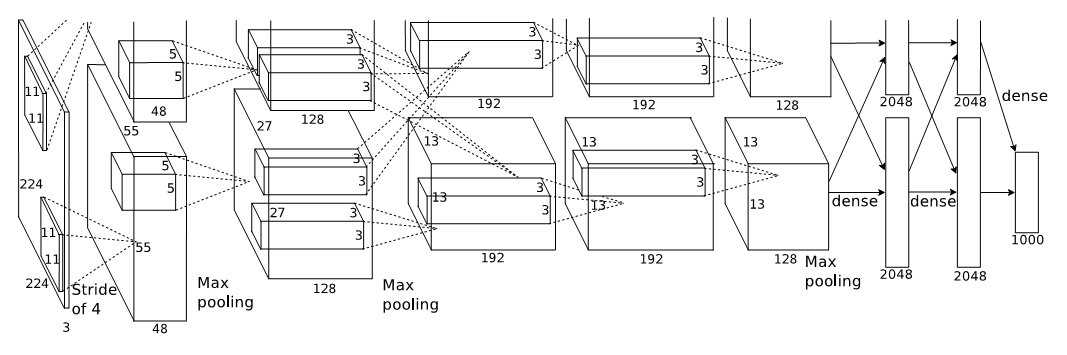 例如在从AlexNet图中左边第一个大长方体(输入图片)到第二个大长方体(图中是两个并列小长方体,这是作者分布式训练的需要,这里分析时可以将二者并起来看)这个过程,即是从的矩阵,经过