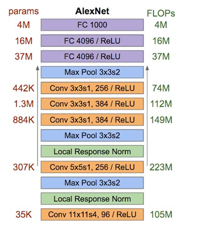 运用上面的规律,我们便可以很轻松地计算出AlexNet网络的parameters和FLOPs数目,如下图(来自网络,出处已不可考):