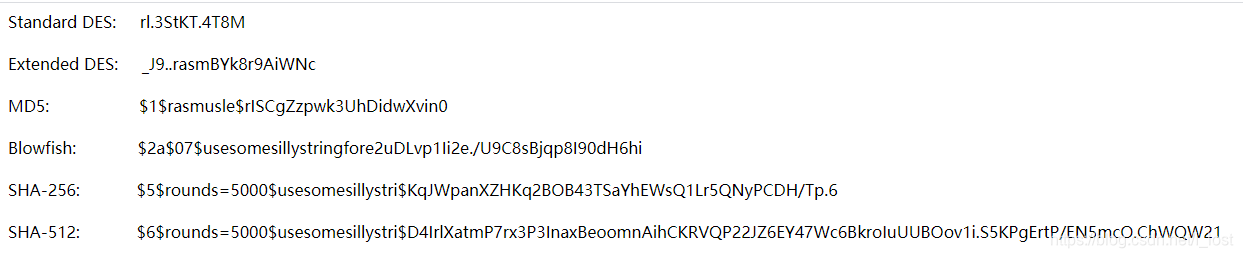 - [CRYPT_MD5] - MD5 加密有 12 个字符的 salt,以 $1$ 开始。