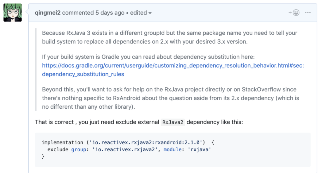 评论发出去了一段时间,并没有收到各路大神的批评,笔者便以为这就是 正确的升级方式,于是在 RxAndroid 的这个 issue 中 沾沾自喜 地进行了分享: