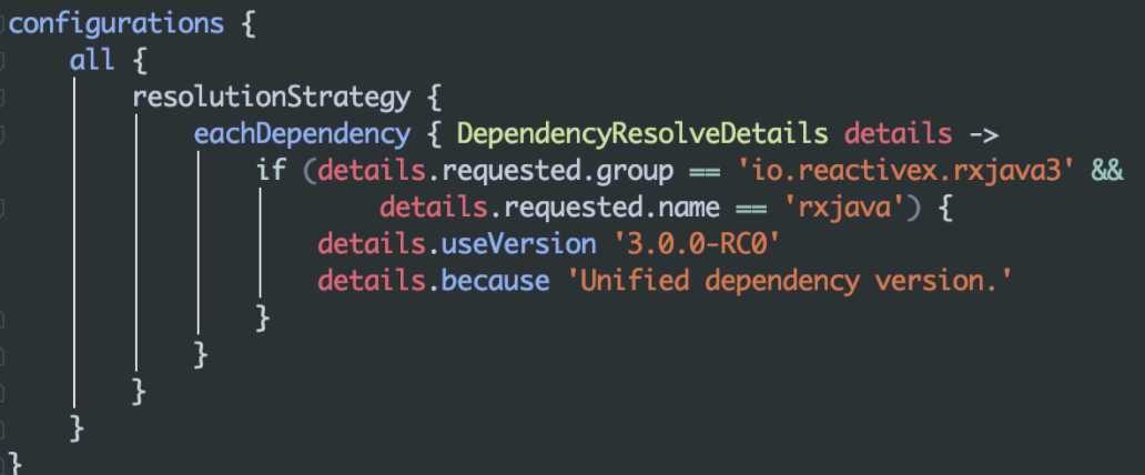 针对类似这种情况,我们可以在gradle的构建过程中强制指定依赖的版本,以笔者的项目为例,我们针对RxJava的版本依赖进行了统一: