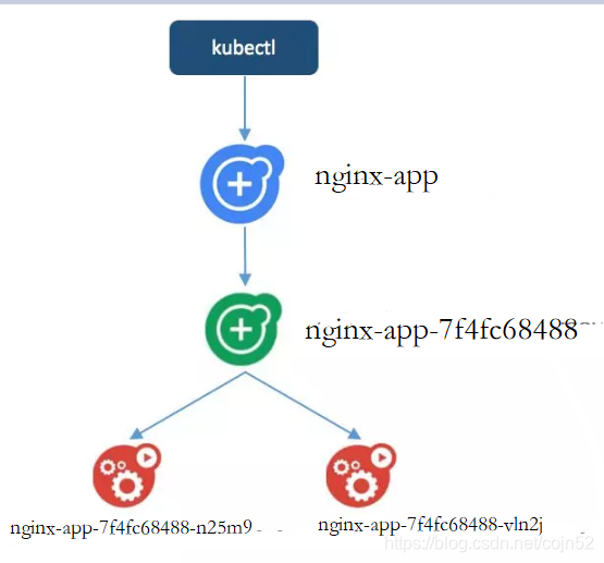 Controlled By 指明此 ReplicaSet 是由 Deployment nginx-app 创建。Events 记录了两个副本 Pod 的创建。接着我们来看 Pod,执行 kubectl get pod: