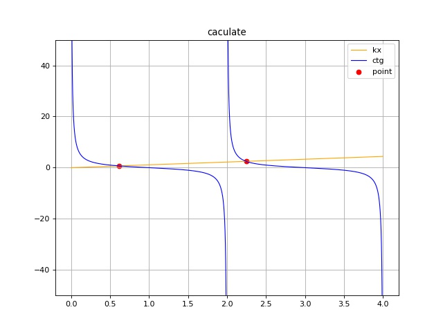 def get_y1():for x_i in x:y1.append(n * x_i)x1.append(x_i)def get_y2():for x_i in x:if(np.sin(x_i) != 0):y = get_ctg(x_i)y2.append(y)x2.append(x_i)#获得两个函数的大致交点