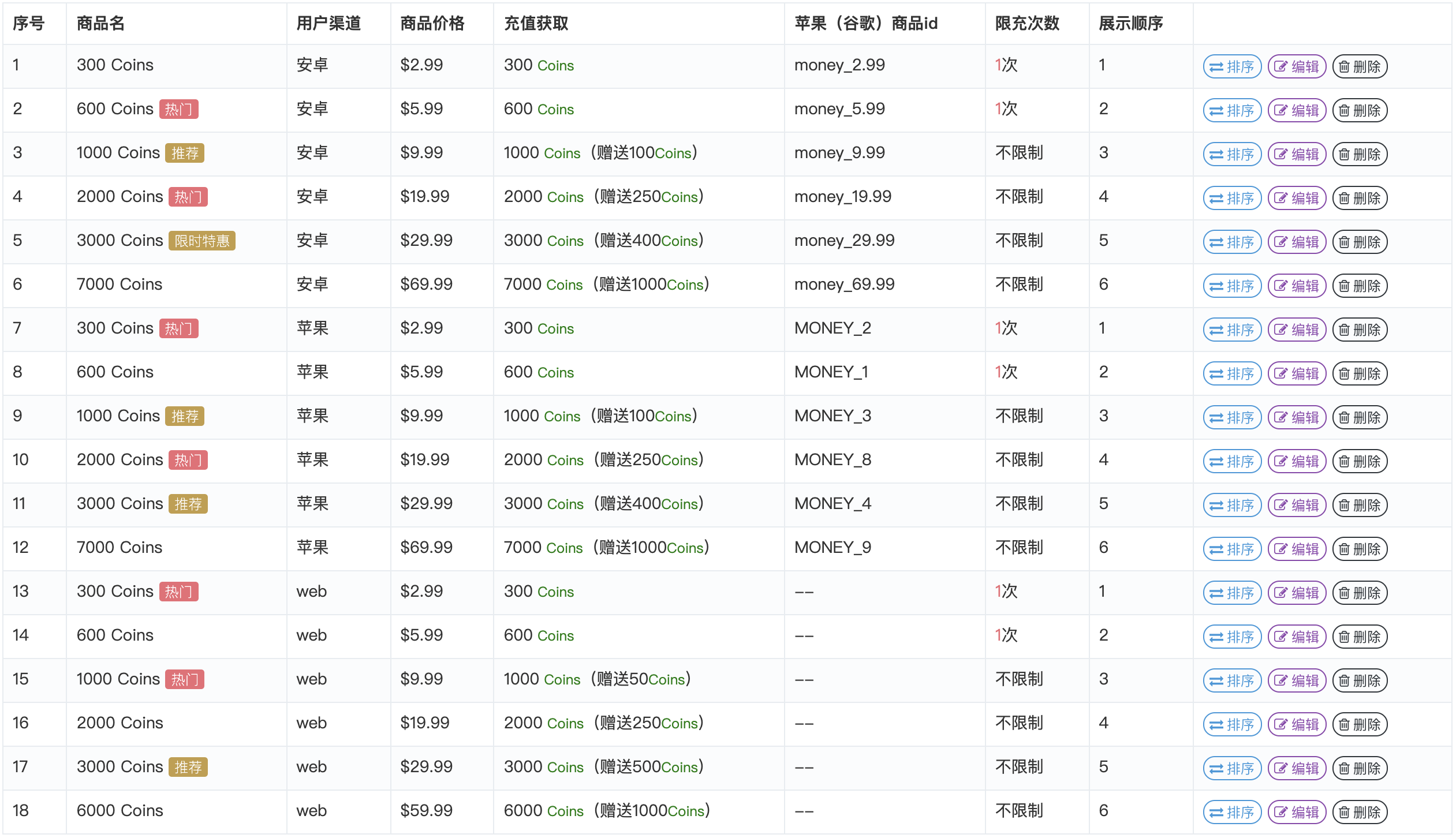 这里解释一下,谷歌和苹果不太一样,苹果的商品充值金额是固定的一批,并不是可以你随便填,而安卓和web端可是可以随便填写商品的价格,但现在安卓和web基本上都会和各端保持一致。如果各端的支付费率不一样的情况下,可以酌情考虑充值金额和赠送的金币可以各不相同。