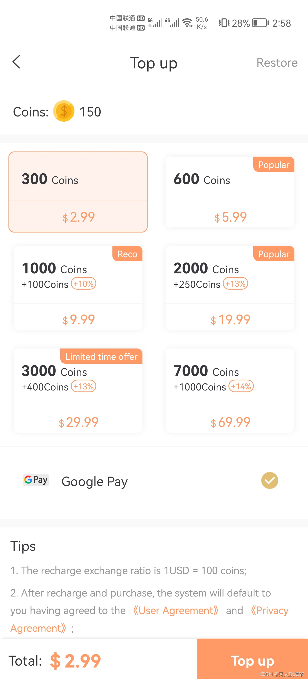 一般充值较低的价格如:2.99$、5.99$是不会赠送金币,是为了刺激充值。充值赠送金币的数量,我们可以多参考一些成熟的App,看别人是充多少赠多少,也要参考自己家的内容,如果你要觉得自己家的内容很好,那你的充值赠送的金币的力度可能需要小一些。