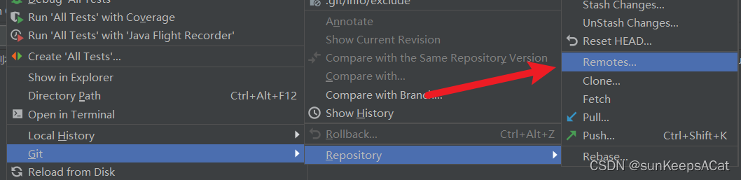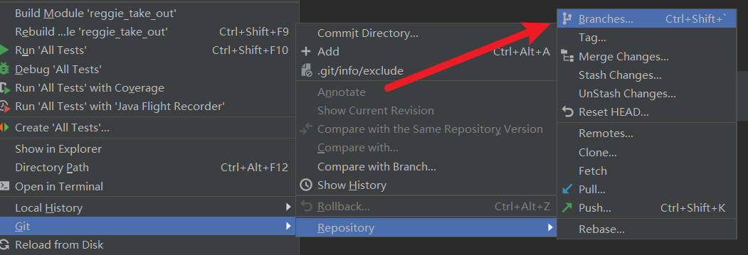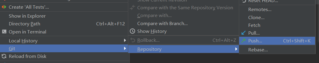 注:在2019的右上角存在两个快捷键;当我们点击顶部菜单栏VCS的时候,也会出现Git选项,里面也会存在相同的操作。