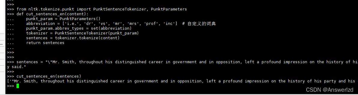 from nltk.tokenize.punkt import PunktSentenceTokenizer, PunktParametersdef cut_sentences_en(content):punkt_param = PunktParameters()abbreviation = ['i.e.', 'dr', 'vs', 'mr', 'mrs', 'prof', 'inc'] # 自定义的词典punkt_param.abbrev_types = set(abbreviation)tokenizer = PunktSentenceTokenizer(punkt_param)sentences = tokenizer.tokenize(content)return sentences