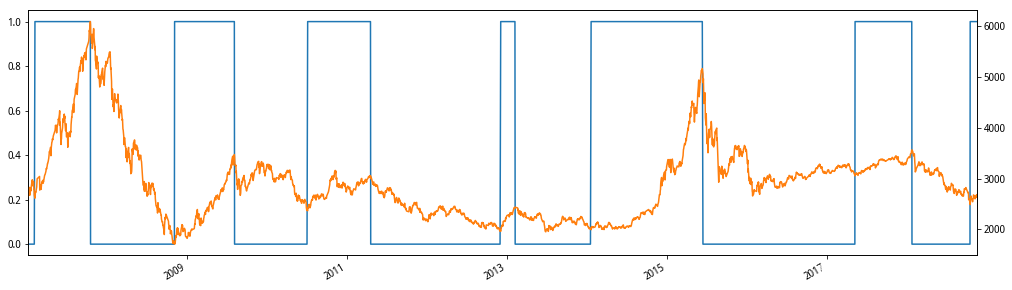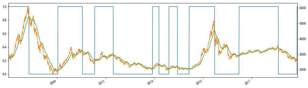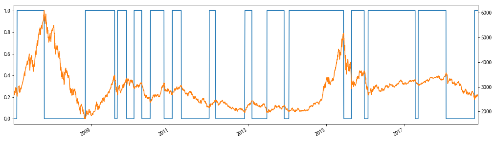 # 很长时间我们可能会沉浸在牛市或者熊市的状态中,实际上早已脱离牛市(熊市),所以使用ema指标简单模拟何时我们发现离开了牛市(熊市) series = pd.ewma(data.close,span=50) bull_data = get_bull_or_bear(series,100) ax = bull_data.plot(style='-',figsize=(17,5)) data.close.plot(secondary_y=True,ax=ax) series.plot(secondary_y=True,ax=ax)