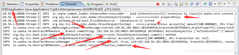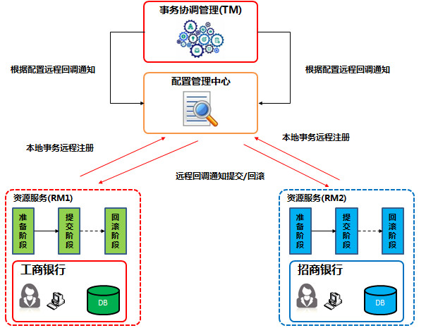 这边可以看到是如何调用icbc的扣款和cmb的打款动作 的,这边根本不需要你再去写什么commit和rollback,只要这两个dubbo provider中的prepare方法执行正常,seata就会自动回调icbc和cmb中的commit方法;只要icbc或者 是cmb中有任何一步抛错,就会触发这两个provider中的业务回滚rollback方法。