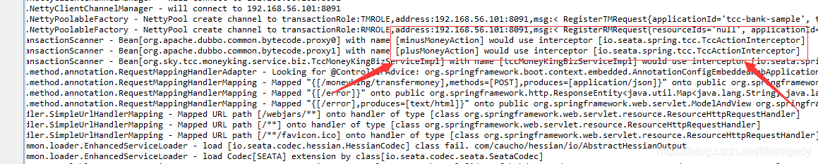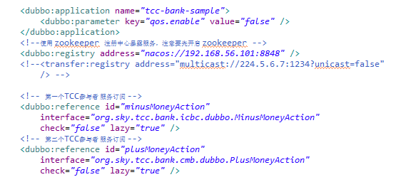<beans xmlns="http://www.springframework.org/schema/beans"xmlns:xsi="http://www.w3.org/2001/XMLSchema-instance"xmlns:dubbo="http://code.alibabatech.com/schema/dubbo"xsi:schemaLocation="http://www.springframework.org/schema/beans http://www.springframework.org/schema/beans/spring-beans.xsdhttp://code.alibabatech.com/schema/dubbohttp://code.alibabatech.com/schema/dubbo/dubbo.xsd"default-autowire="byName"><dubbo:application name="tcc-bank-sample"><dubbo:parameter key="qos.enable" value="false" /></dubbo:application><!--使用 zookeeper 注册中心暴露服务,注意要先开启 zookeeper --><dubbo:registry address="nacos://192.168.56.101:8848" /><!--<transfer:registry address="multicast://224.5.6.7:1234?unicast=false" /> --><!-- 第一个TCC参与者 服务订阅 --><dubbo:reference id="minusMoneyAction"interface="org.sky.tcc.bank.icbc.dubbo.MinusMoneyAction"check="false" lazy="true" /><!-- 第二个TCC参与者 服务订阅 --><dubbo:reference id="plusMoneyAction"interface="org.sky.tcc.bank.cmb.dubbo.PlusMoneyAction"check="false" lazy="true" /></beans>