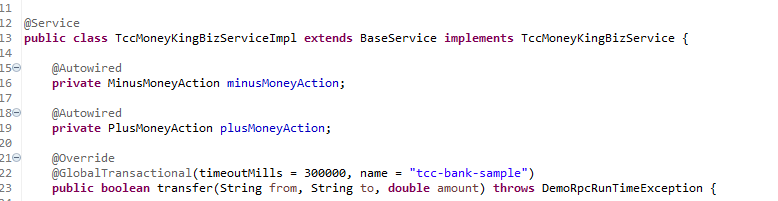 public class TccMoneyKingBizServiceImpl extends BaseService implements TccMoneyKingBizService {@Autowiredprivate MinusMoneyAction minusMoneyAction;@Autowiredprivate PlusMoneyAction plusMoneyAction;@Override@GlobalTransactional(timeoutMills = 300000, name = "tcc-bank-sample")public boolean transfer(String from, String to, double amount) throws DemoRpcRunTimeException {boolean answer = minusMoneyAction.prepareMinus(null, from, amount);if (!answer) {// 扣钱参与者,一阶段失败; 回滚本地事务和分布式事务throw new DemoRpcRunTimeException("账号:[" + from + "] 预扣款失败");}// 加钱参与者,一阶段执行answer = plusMoneyAction.prepareAdd(null, to, amount);if (!answer) {throw new DemoRpcRunTimeException("账号:[" + to + "] 预收款失败");}return true;}}
