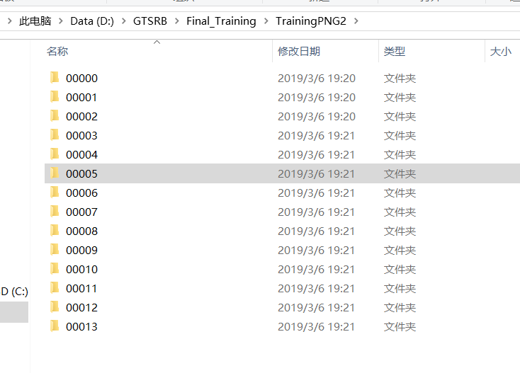 GTSRB 德标的交通标志数据集,但是注意到训练集和测试集的目录不一样啊,,,所以上面只是训练集的。测试集就没有class_path ,,就是没有分类这个文件夹。。。。(坑了半小时,令人窒息)