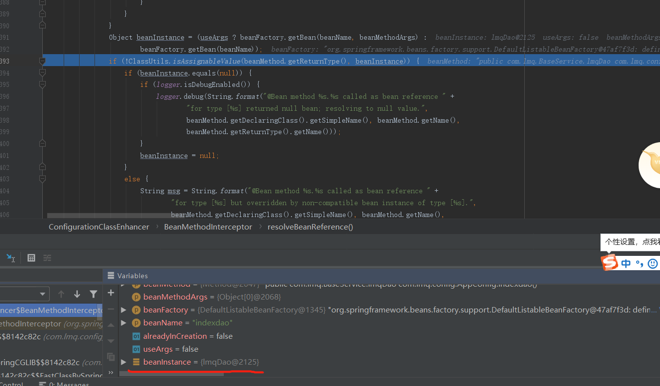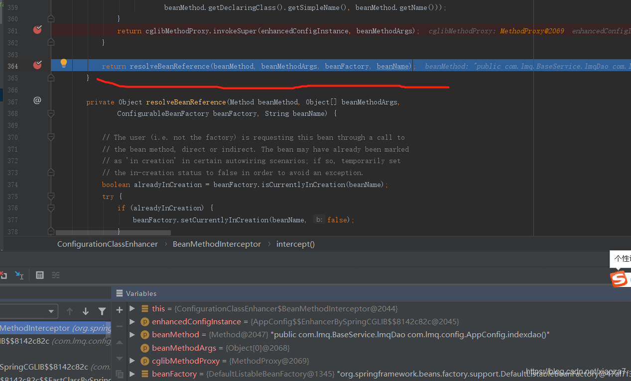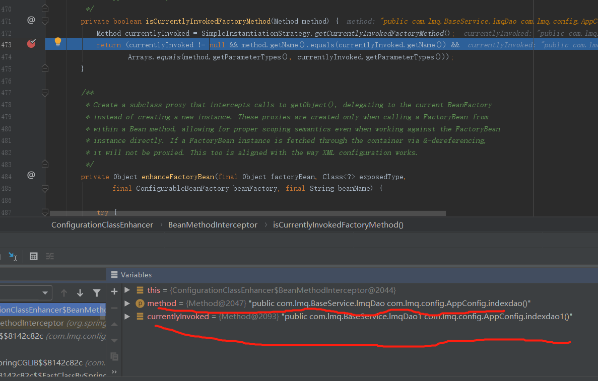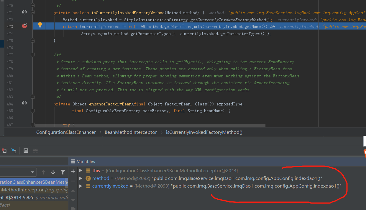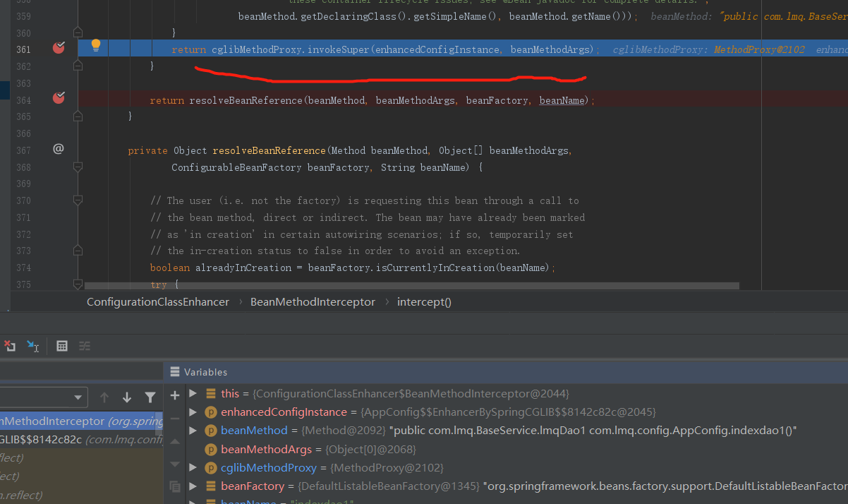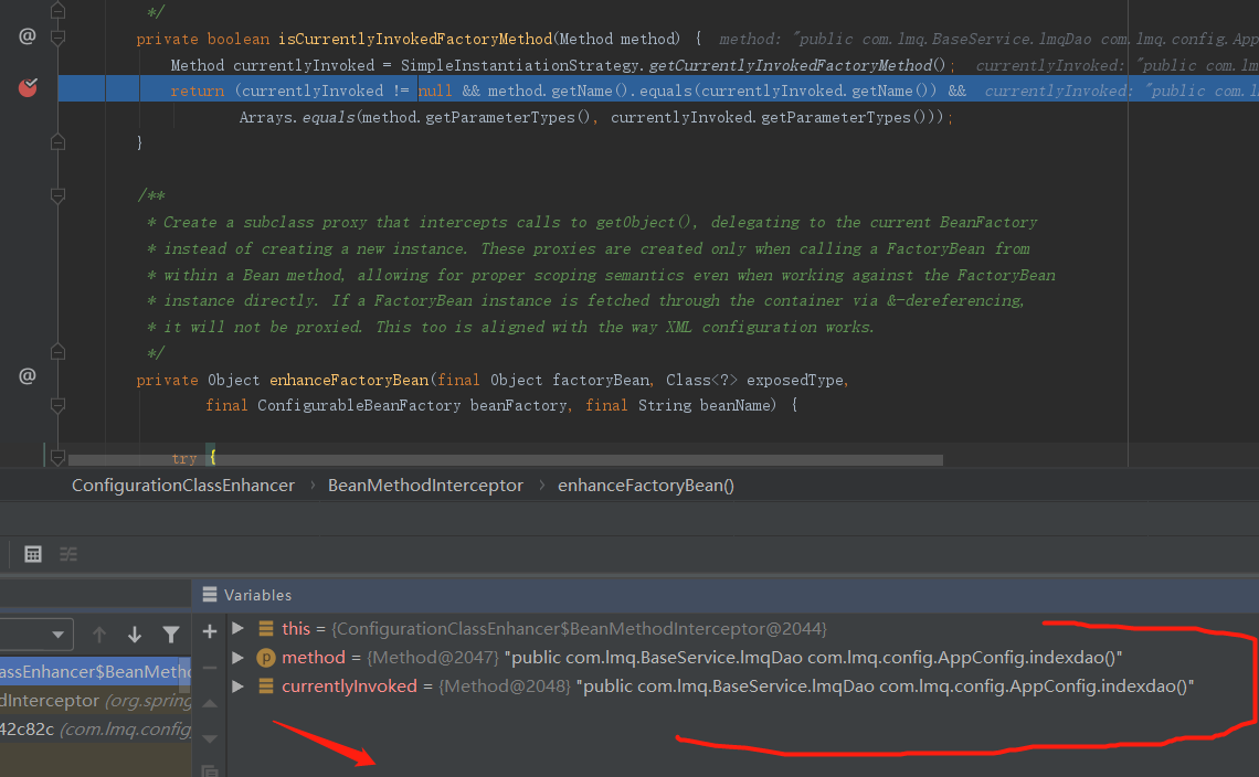 这里需要细看详细的代理类和拦截细节,为了看是一次调用 new,还是getbean,,(isCurrentlyInvokedFactoryMethod(beanMethod)) 起了重要作用
