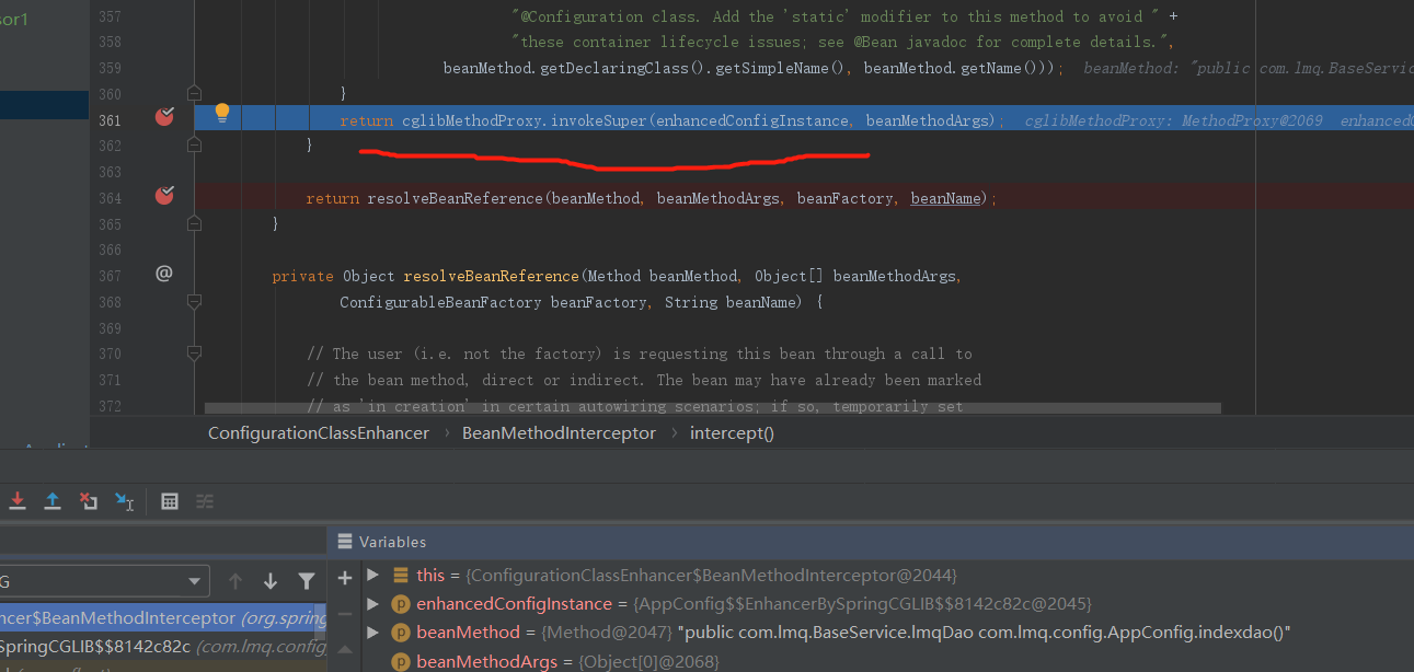return cglibMethodProxy.invokeSuper(enhancedConfigInstance, beanMethodArgs)