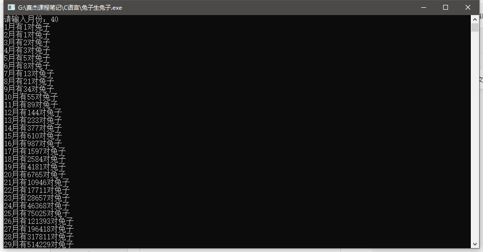 题目:古典问题(兔子生崽):有一对兔子,从出生后第3个月起每个月都生一对兔子,小兔子长到第三个月后每个月又生一对兔子,假如兔子都不死,问每个月的兔子总数为多少?(输出前40个月即可)