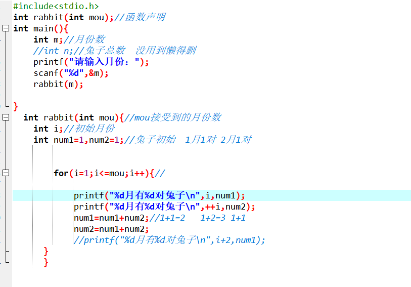程序分析:兔子的规律为数列1,1,2,3,5,8,13,21....,即下个月是上两个月之和(从第三个月开始)。