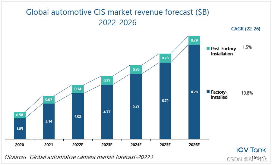 根据ICV的数据统计,2021全球车载CIS总价值为38.1亿美元,前装车载摄像头及CIS必须符合车规级的产品性能要求,市场价值较后装市场要高很多。2021年前装车载CIS市场总价值为31.4亿美元,后装CIS为6.7亿美元,后装CIS单价几乎为前装的一半。由于受到全球车载半导体产能吃紧的影响,车载CIS价格提升带动整体市场价值提升,此次ICV对于2021年的市场统计,较2020年的市场预估要高出4.3%。