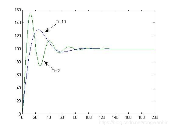 于是,老师告诉我们增大积分时间I有利于减小超调,减小振荡,使系统的稳定性增加,但是系统静差消除时间变长。如下图: