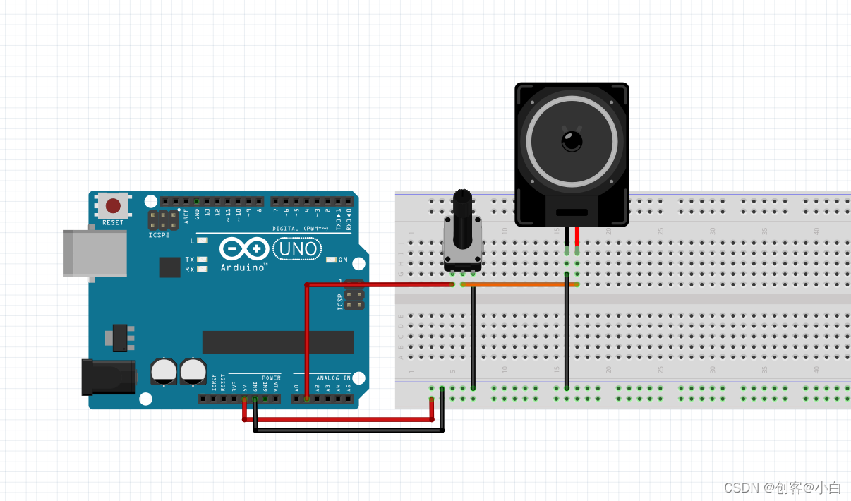 滑动变阻器的正极接arduino的A0,GND接arduino的GND,out接喇叭的正极,喇叭的负极接地