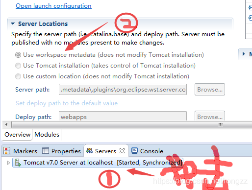 2、双击Tomcat,会在出现详细信息。可以看到Server Locations默认选择的是第一项,也就是使用工程根目录的相关子目录作为部署路径,而我需要部署到Tomcat下,那么只需要选择第二项,保存重启就可以了。但现在看到它是灰色的,选不了,那是因为我之前已经使用了Tomcat运行项目,需要清除掉Tomcat绑定的项目才可以重新选择部署路径。