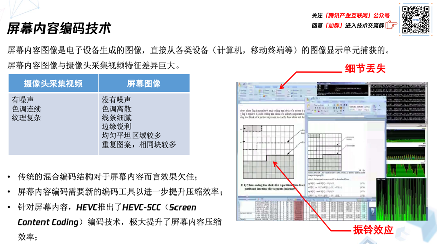传统的视频编码采用的是预测加变换的混合编码结构,这种方式适合摄像头采集的视频。但是对于屏幕内容,它的编码效率不太好。为了提升压缩效率, HEVC (High Efficiency Video Coding)针对屏幕内容专门推出了HEVC-SCC编码标准,可以大大提升屏幕内容的编码效率。