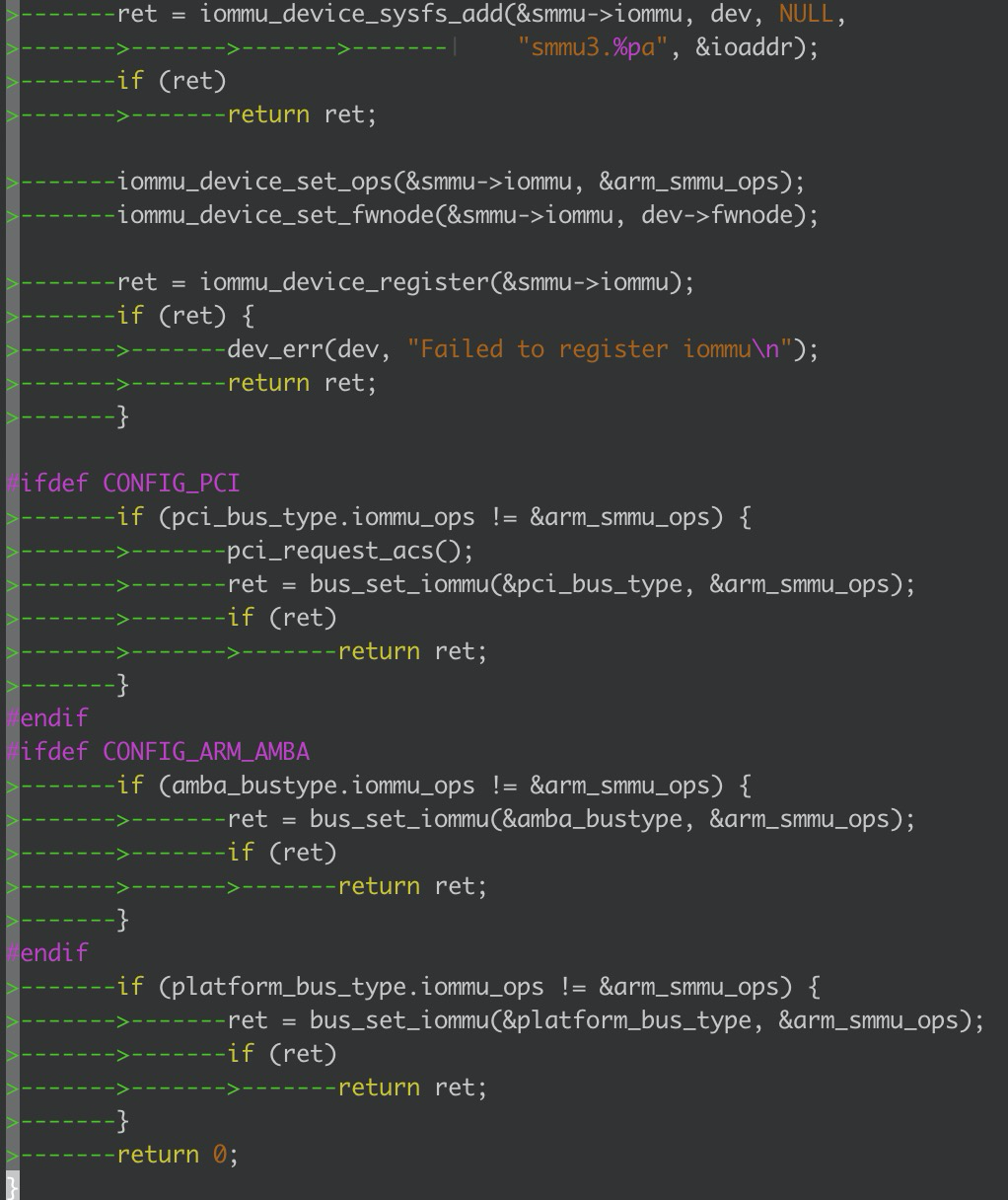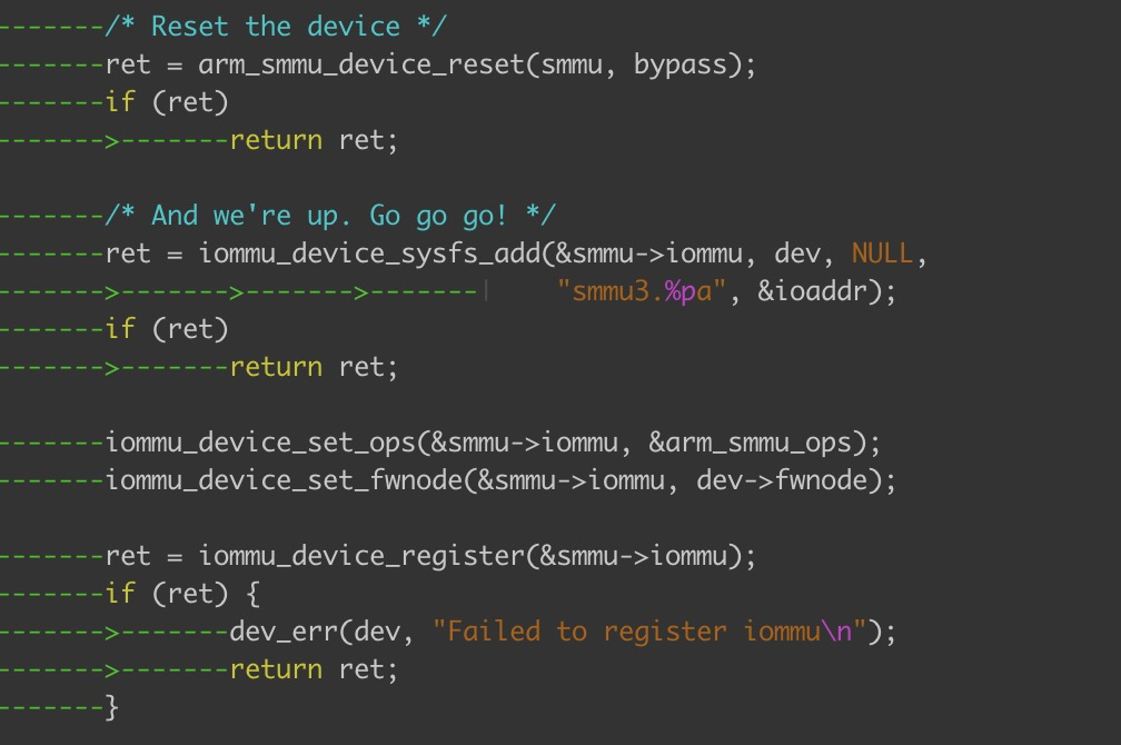 上图是smmu 驱动初始化的剩下的部分,我们可以看出来里面第一个函数是arm_smmu_device_reset,这个函数是干嘛的呢,我们前面是不是已经给这个smmu在内存中分配了几个队列和stream table的目录项?那这些数据结构的基地址总该让smmu知道吧?这个函数就是将这些基地址给放到smmu的控制寄存器中的;当前我们需要的东西给初始化完后,smmu驱动接下来就是将smmu的基本数据结构注册到上层的iommu抽象框架里,让iommu结构能够调用到smmu,这个在后面再说。