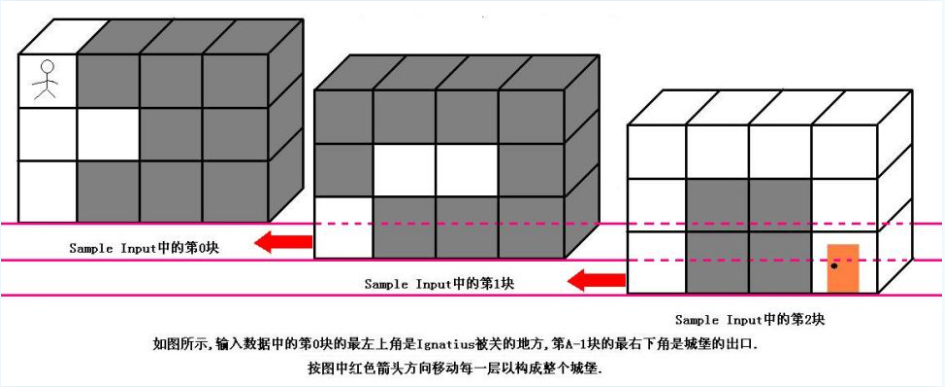 输入数据的第一行是一个正整数K,表明测试数据的数量.每组测试数据的第一行是四个正整数A,B,C和T(1<=A,B,C<=50,1<=T<=1000),它们分别代表城堡的大小和魔王回来的时间.然后是A块输入数据(先是第0块,然后是第1块,第2块…),每块输入数据有B行,每行有C个正整数,代表迷宫的布局,其中0代表路,1代表墙.(如果对输入描述不清楚,可以参考Sample Input中的迷宫描述,它表示的就是上图中的迷宫)