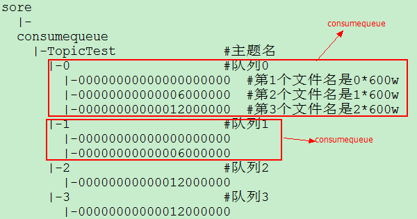一个ConsumeQueue等同一个MappedFileQueue等同多个MappedFile,为什么这么做呢?因为一个消息队列会有多个文件,如下图