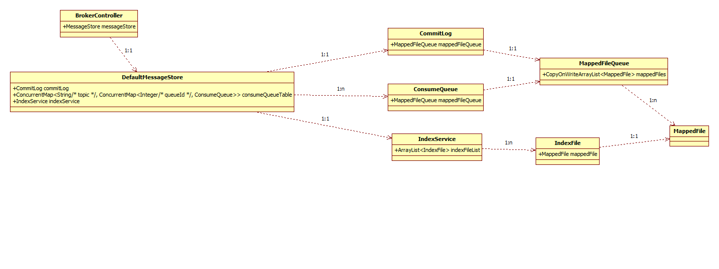 最终加载的commitlog文件保存到了CommitLog.mappedFileQueue.mappedFiles集合中。而commitlog对象又被包含在DefaultMessageStore,DefaultMessageStore又被包含在BrokerController对象内,最终在broker启动加载commitlog文件就被加载到了broker上。