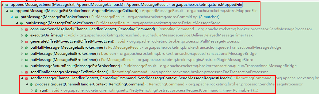 在开启的情况下,broker启动进行load操作加载commitlog consumequeue indexfile文件都是使用第一个构造器,在broker运行过程中,consumequeue indexfiel创建也是使用第一个构造器,在broker运行过程中,创建commitlog文件都是使用的第二个构造器,ctrl+alt+H查看调用如下图