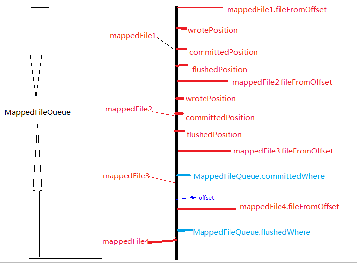 再强调下,MappedFile对应一个个具体的文件,比如commitlog物理文件,但是MappedFileQueue对应的是一组物理文件,它们的关系就如图所示,wrotePosition,committedPosition,flushedPosition都是相对于单个物理文件来说的,而flushedWhere,committedWhere是相对于这一组物理文件来说的,以commitlog文件为例,每个MappedFile的区间范围是[(N-1)*1024^3~N*1024^3],其中N表示是第几个文件,而MappedFileQueue的区间范围是[0~N*1024^3]。这一组物理文件也可以用commitlog/consumequeue来表达,因为它们也都包装了MappedFileQueue。比如图中的offset就是相对于MappedFileQueue来说的,根据offset就可以得出具体所处的单个物理文件MappedFile,计算方式如下(offset/1024^3) - (mappedFile1.fileFromOffset/1024^) 即为该offset所属的MappedFile在MappedFileQueue的索引位置。