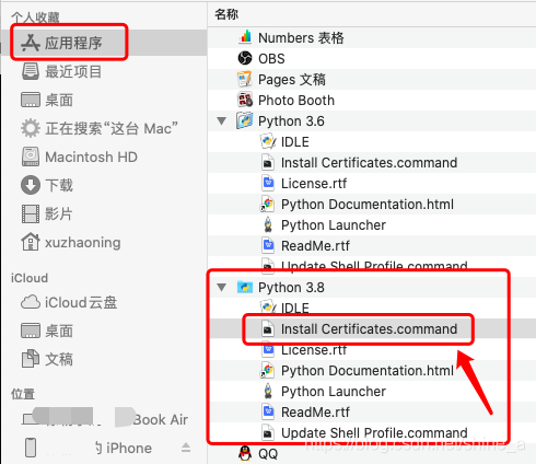 在应用程序中,找到目前用的Python版本,双击install Certificates.command,安装成功之后,就可以了。