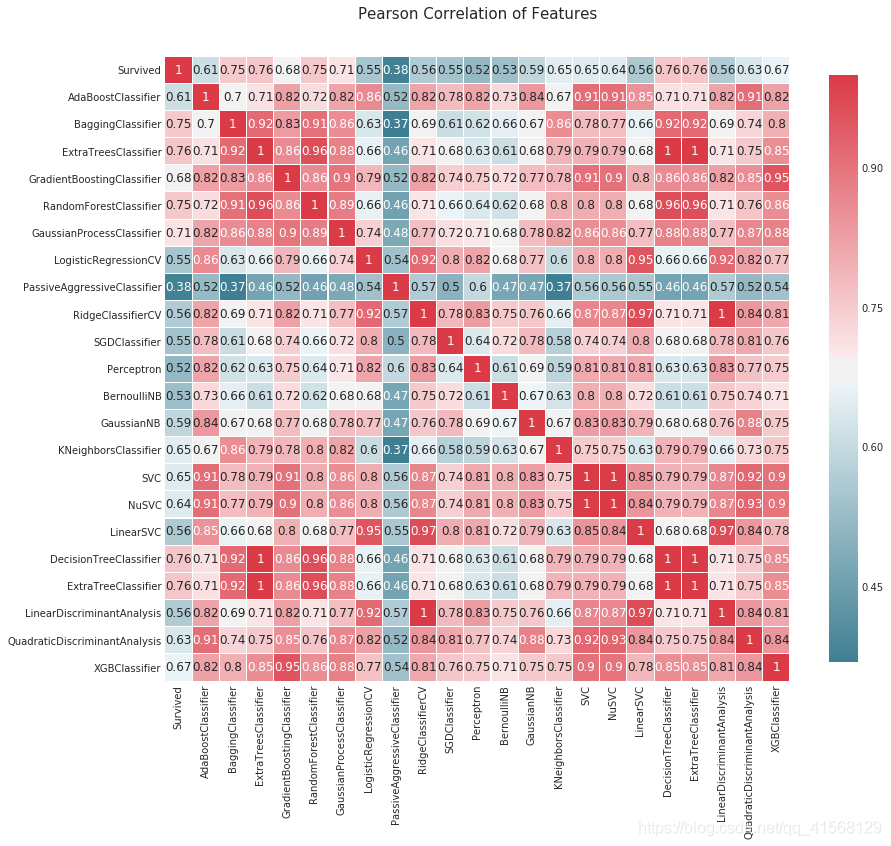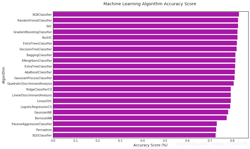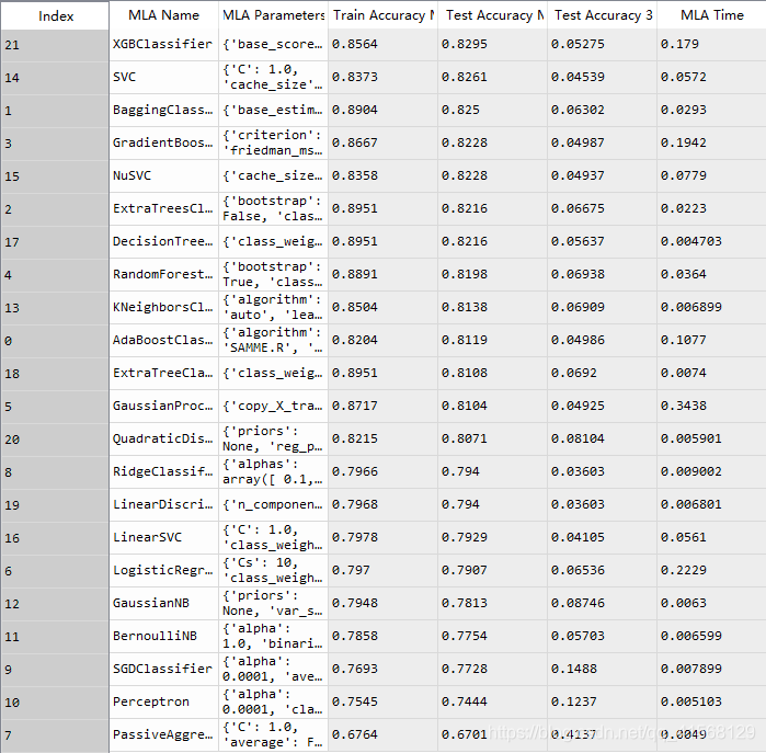 grid_seed = [0]grid_param = [[{#AdaBoostClassifier - http://scikit-learn.org/stable/modules/generated/sklearn.ensemble.AdaBoostClassifier.html'n_estimators': grid_n_estimator, #default=50'learning_rate': grid_learn, #default=1#'algorithm': ['SAMME', 'SAMME.R'], #default=’SAMME.R'random_state': grid_seed}],[{#BaggingClassifier - http://scikit-learn.org/stable/modules/generated/sklearn.ensemble.BaggingClassifier.html#sklearn.ensemble.BaggingClassifier'n_estimators': grid_n_estimator, #default=10'max_samples': grid_ratio, #default=1.0'random_state': grid_seed}],[{#ExtraTreesClassifier - http://scikit-learn.org/stable/modules/generated/sklearn.ensemble.ExtraTreesClassifier.html#sklearn.ensemble.ExtraTreesClassifier'n_estimators': grid_n_estimator, #default=10'criterion': grid_criterion, #default=”gini”'max_depth': grid_max_depth, #default=None'random_state': grid_seed}],[{#GradientBoostingClassifier - http://scikit-learn.org/stable/modules/generated/sklearn.ensemble.GradientBoostingClassifier.html#sklearn.ensemble.GradientBoostingClassifier#'loss': ['deviance', 'exponential'], #default=’deviance’'learning_rate': [.05], #default=0.1 -- 12/31/17 set to reduce runtime -- The best parameter for GradientBoostingClassifier is {'learning_rate': 0.05, 'max_depth': 2, 'n_estimators': 300, 'random_state': 0} with a runtime of 264.45 seconds.'n_estimators': [300], #default=100 -- 12/31/17 set to reduce runtime -- The best parameter for GradientBoostingClassifier is {'learning_rate': 0.05, 'max_depth': 2, 'n_estimators': 300, 'random_state': 0} with a runtime of 264.45 seconds.#'criterion': ['friedman_mse', 'mse', 'mae'], #default=”friedman_mse”'max_depth': grid_max_depth, #default=3 'random_state': grid_seed}],[{#RandomForestClassifier - http://scikit-learn.org/stable/modules/generated/sklearn.ensemble.RandomForestClassifier.html#sklearn.ensemble.RandomForestClassifier'n_estimators': grid_n_estimator, #default=10'criterion': grid_criterion, #default=”gini”'max_depth': grid_max_depth, #default=None'oob_score': [True], #default=False -- 12/31/17 set to reduce runtime -- The best parameter for RandomForestClassifier is {'criterion': 'entropy', 'max_depth': 6, 'n_estimators': 100, 'oob_score': True, 'random_state': 0} with a runtime of 146.35 seconds.'random_state': grid_seed}],[{ #GaussianProcessClassifier'max_iter_predict': grid_n_estimator, #default: 100'random_state': grid_seed}],[{#LogisticRegressionCV - http://scikit-learn.org/stable/modules/generated/sklearn.linear_model.LogisticRegressionCV.html#sklearn.linear_model.LogisticRegressionCV'fit_intercept': grid_bool, #default: True#'penalty': ['l1','l2'],'solver': ['newton-cg', 'lbfgs', 'liblinear', 'sag', 'saga'], #default: lbfgs'random_state': grid_seed}],[{#BernoulliNB - http://scikit-learn.org/stable/modules/generated/sklearn.naive_bayes.BernoulliNB.html#sklearn.naive_bayes.BernoulliNB'alpha': grid_ratio, #default: 1.0}],#GaussianNB - [{}],[{#KNeighborsClassifier - http://scikit-learn.org/stable/modules/generated/sklearn.neighbors.KNeighborsClassifier.html#sklearn.neighbors.KNeighborsClassifier'n_neighbors': [1,2,3,4,5,6,7], #default: 5'weights': ['uniform', 'distance'], #default = ‘uniform’'algorithm': ['auto', 'ball_tree', 'kd_tree', 'brute']}],[{#SVC - http://scikit-learn.org/stable/modules/generated/sklearn.svm.SVC.html#sklearn.svm.SVC#http://blog.hackerearth.com/simple-tutorial-svm-parameter-tuning-python-r#'kernel': ['linear', 'poly', 'rbf', 'sigmoid'],'C': [1,2,3,4,5], #default=1.0'gamma': grid_ratio, #edfault: auto'decision_function_shape': ['ovo', 'ovr'], #default:ovr'probability': [True],'random_state': grid_seed}],[{#XGBClassifier - http://xgboost.readthedocs.io/en/latest/parameter.html'learning_rate': grid_learn, #default: .3'max_depth': [1,2,4,6,8,10], #default 2'n_estimators': grid_n_estimator, 'seed': grid_seed }] ]start_total = time.perf_counter() #https://docs.python.org/3/library/time.html#time.perf_counter