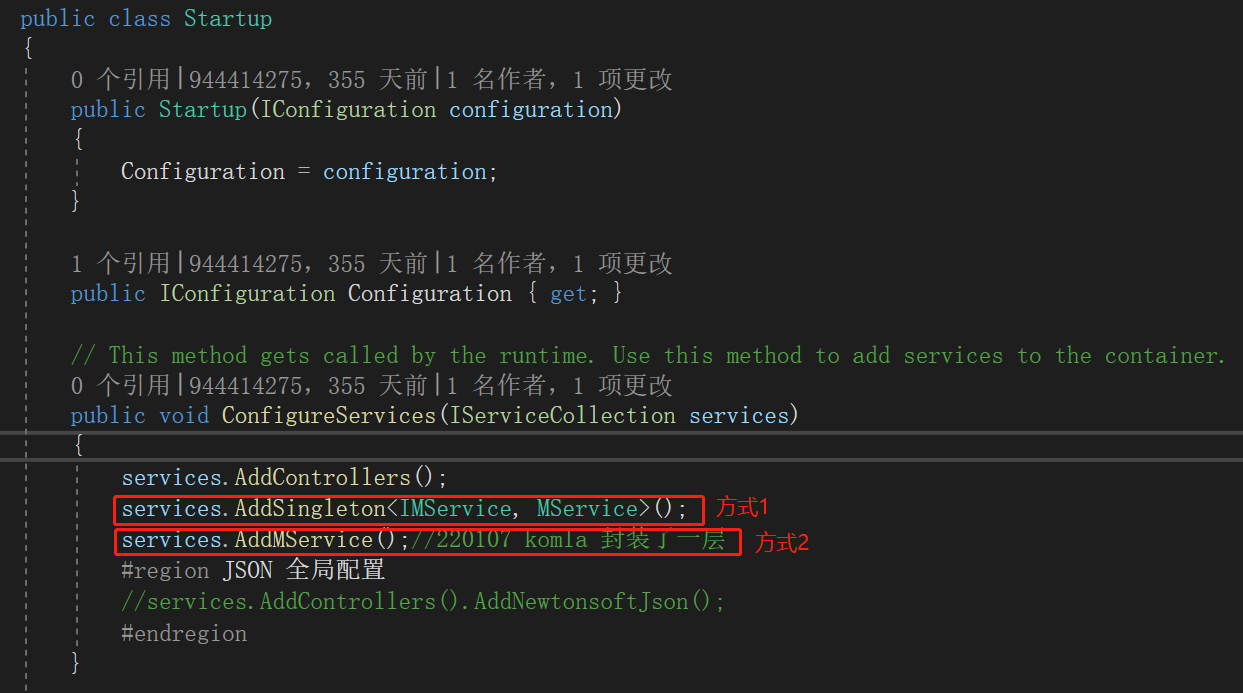 如果自己开发的话,官网那种单一的注册方案就不合适了,需要对自定义的服务及服务对象做一个封装,因此需要两步准备,第一步是自定义服务,第二步是写一个扩展方法用来注册服务。