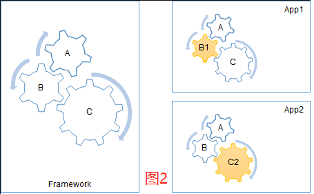 图1展示了将应用程序控制的业务流程反转给框架,这有什么好处呢?图2给出了好处,我们可以对框架给的标准流程中不适合本业务的部分进行定制开发,就是说我们不需要重复造轮子,只需要把精力放在所开发的应用程序的业务流程上就可以。