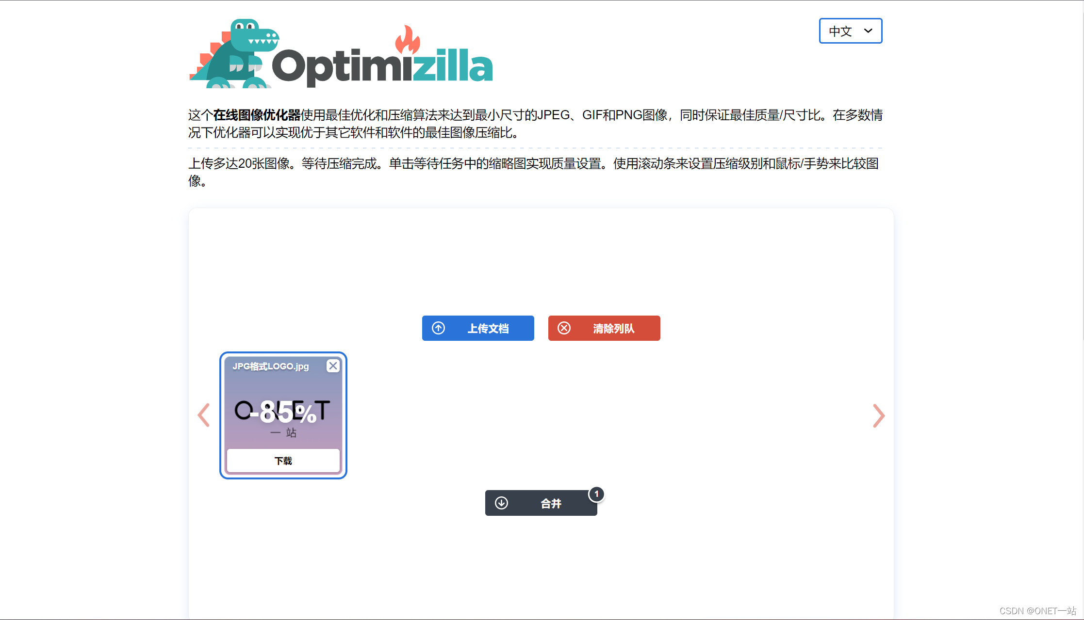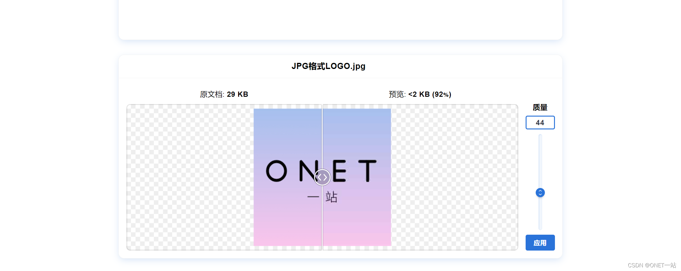 ONETer用logo图做测试,原始logo图大小是29kb,上传后默认压缩了85%,仅剩4.3kb,而且图片质量没有明显的下降。目前Optimizilla支持jpg、png和gif格式的图片压缩。