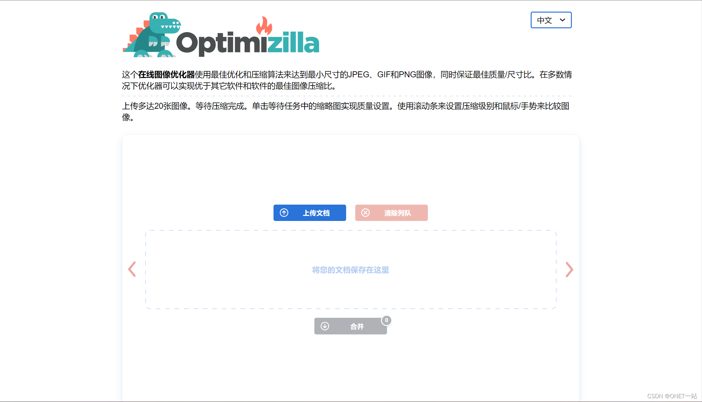 Optimizilla支持中文界面。使用者打开首页后,点击“上传文档”就可以开始上传需要压缩的图片,一次最多可以上传20张图片。