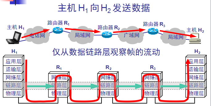 在两个相邻结点之间传送数据时,数据链路层将网络层交下来的IP数据报组装成帧(framing),在两个相邻结点之间的链路上“透明”地传送帧中的数据。
