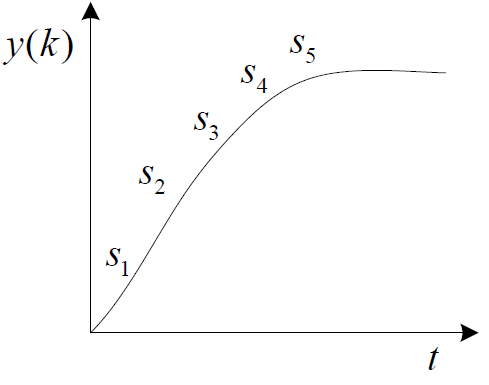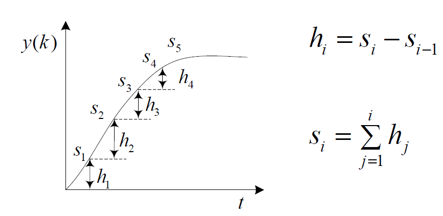 当模型长度N足够长时,参数值几乎就是连续的了。假设Δu=0.05的阶跃加进去,ti时间单位,yi输出,记录Δyi,除以Δui得到模型参数Δsi。