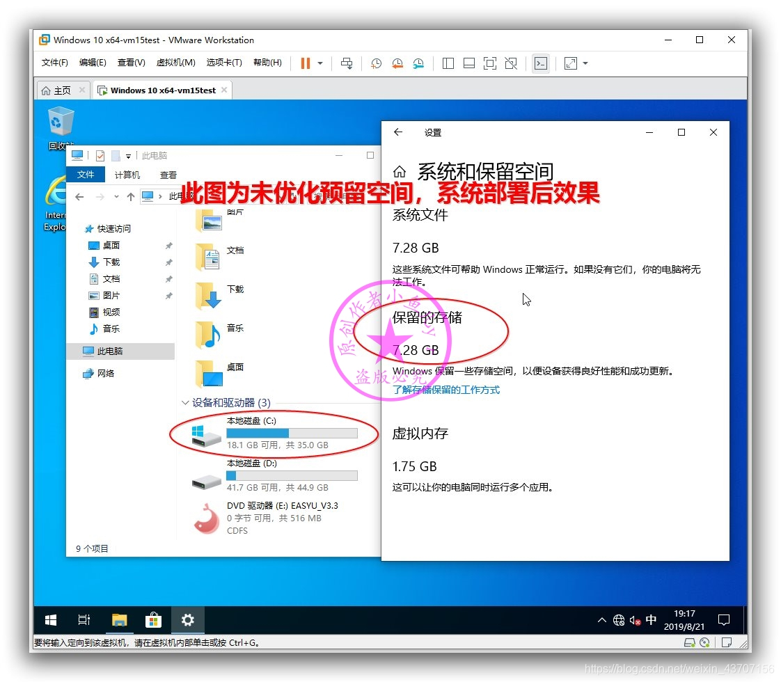 最近经常有朋友问我,WIN10自从出了1903后,封装后的系统C盘怎么凭空的少了7G左右的磁盘空间。其实,这是因为被WIN 10 1903预留空间的功能给“吞”了,而这个功能是一个很鸡肋的功能。如下图,可以看到磁盘被占用17G空间,其中预留空间就足足占用了7.28G。系统预留空间功能即系统为了确保更新的正常进行,Win10将划拨一部分磁盘空间给应用程序、服务等创建临时文件使用,以避免用户安装补丁或者更新系统版本时遭遇“剩余空间不足”的报错。在磁盘空间绰绰有余的情况下,禁用预留空间对系统更新也没有任何影响。特别是对于不更新系统的用户来说,这个功能不仅完全没有用,反而还白白的占用了7G空间。所以,这个功能其实很鸡肋。那么如何禁用WIN10 1903系统预留7G空间?