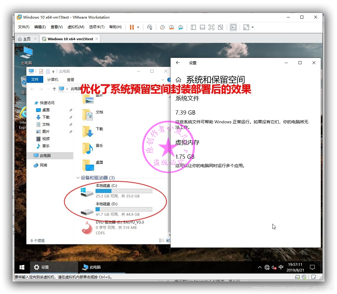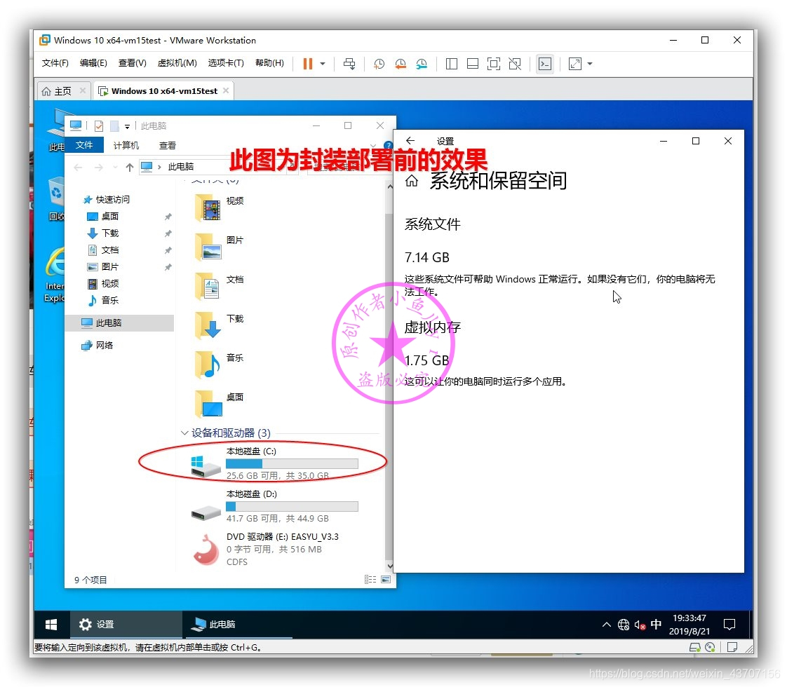 对于已经进入桌面运行环境的系统,在封装前如果按照网上的方法修改注册表是无法生效的。修改注册表的方法只能在定制母盘的时候操作才能生效。不过,这里提供一个在封装前的桌面运行环境里可以生效的优化的方法。先进入封装前的桌面运行环境,如下图,是原版镜像安装后的效果,此时,系统预留空间7G没有被占用,那是因为我的母盘关闭了系统预留空间功能。但是,如果不再次处理系统预留空间功能的话,封装部署后的系统就和上一个图的效果一模一样,也就是系统封装后,预留空间的功能会被系统重置还原。就像输入法,任务栏,开始屏幕被还原一样的道理。