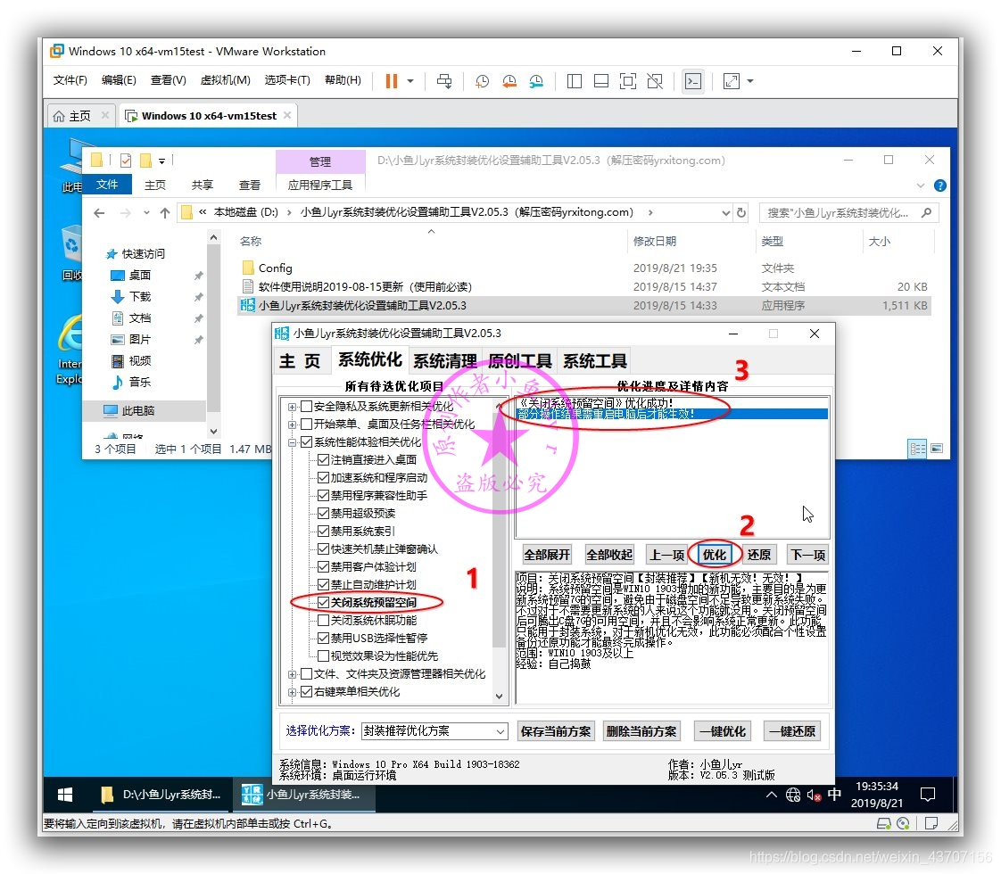 那么我们怎么优化它呢?你们可以去我的博客找到最新的小鱼儿yr系统封装优化设置工具,下载2.05.2及以上的版本即可。百度一下我的昵称就可以找到我的博客,然后运行工具,并找到《系统性能体验相关》里的《关闭系统预留空间》并单独执行优化,提示成功即可。