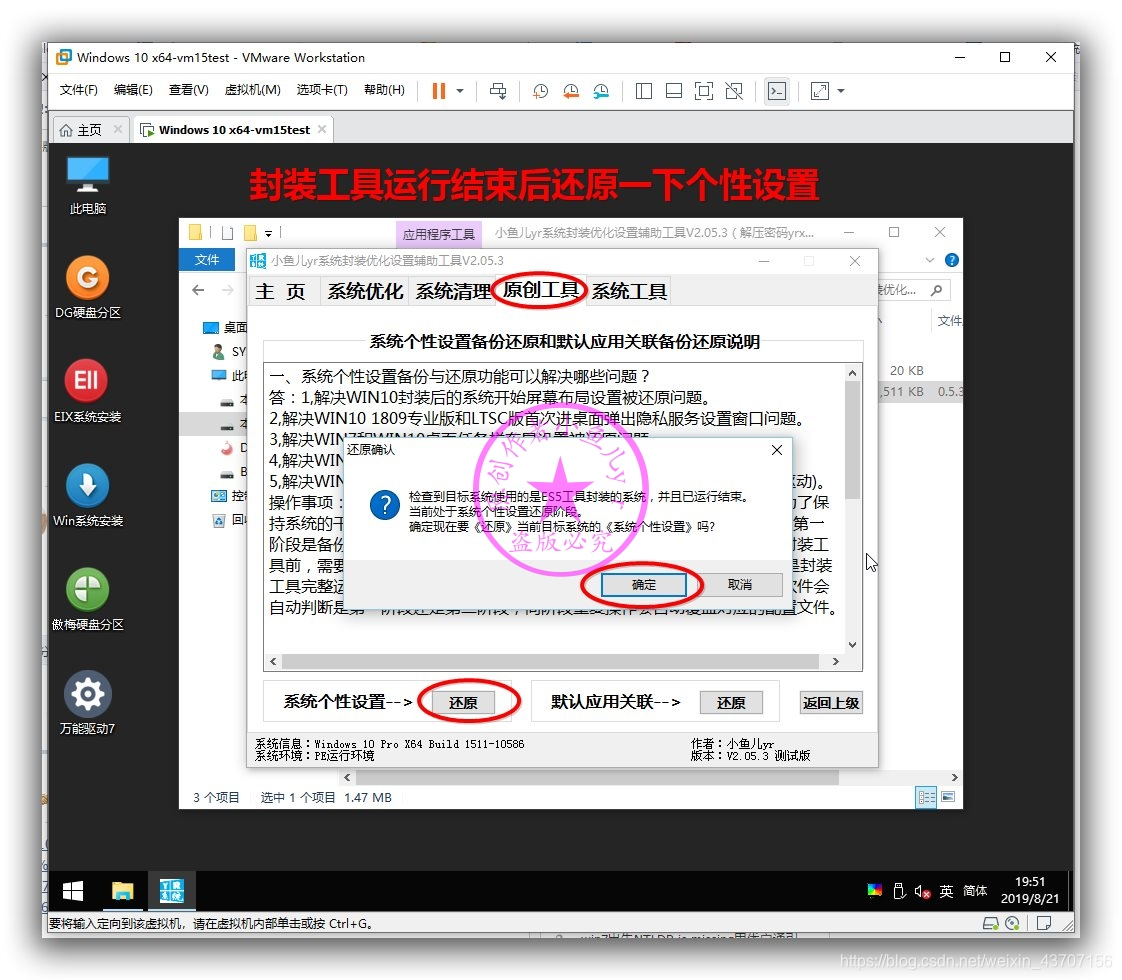 然后进入桌面运行环境运行ES5封装工具第一阶段,这里就不截图了。ES5封装工具第一阶段运行结束后,再次进入PE环境并运行封装工具并完成第二阶段。封装工具运行结束后,这时候先不要打包镜像。然后继续再次执行辅助工具,并还原系统个性设置。然后就可以打包镜像了,这样优化后打包的镜像拿去重装系统的话就不会出现被“吞”掉7G的预留空间了。
