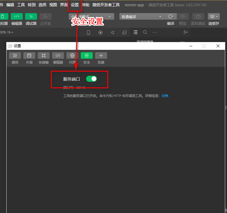 在微信开发者工具里点击设置》安全设置,开启服务端口